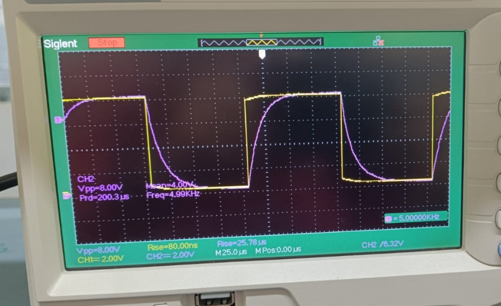 Input: Square wave, Vpp = 8 V, frequency ≈ 5 kHz (period = 200.3 µs). From the oscilloscope, the rise time of the RC circuit output was observed to be 25.78 µs. CH1 (yellow) shows the square wave input; CH2 (purple) shows the exponential capacitor response.