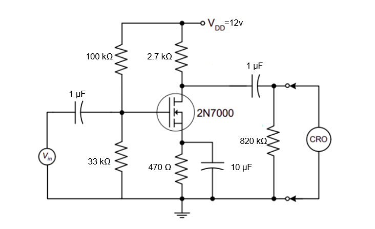 - Set up the circuit on a breadboard as per the circuit diagram: R1 = 100 kΩ, R2 = 33 kΩ, RD = 2.7 kΩ, RS = 470 Ω, RL = 820 kΩ, CC = 1 µF, CS = 10 µF, VDD = 12 V.