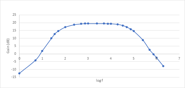 | Frequency (Hz) | log f | Output Voltage Vpp (V) | Gain (dB) |