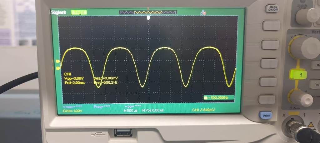 Oscilloscope — 500 Hz: Output Vpp = 3.68 V, Freq = 500.2 Hz. Near mid-band — gain approaching plateau.
