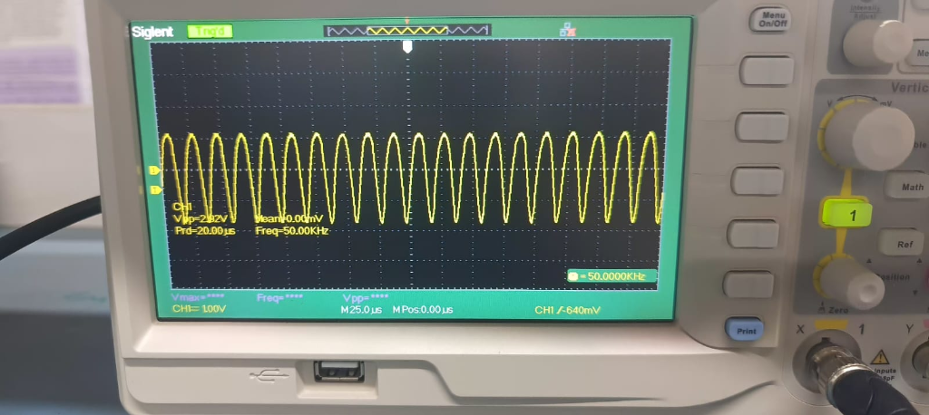 Oscilloscope — 50 kHz: Output Vpp = 2.92 V, Freq = 50 kHz. High-frequency region — gain has rolled off from mid-band peak.