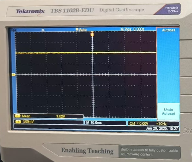 Oscilloscope — Differential amp: Mean = 1.02 V for V1 = 2 V, V2 = 1 V (theoretical: 1 V). Error ≈ 0.02 V, attributed to wire resistance and non-ideal Op-Amp.