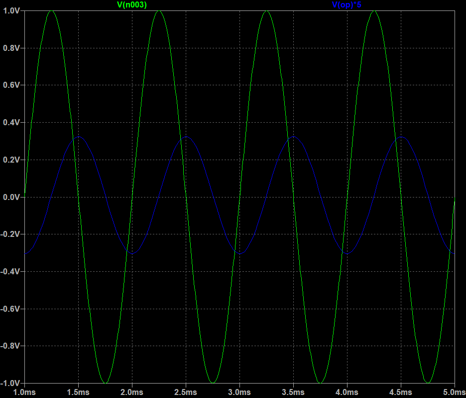 LTspice simulation — Differentiator with sine input (green, V(n003)): output (blue, V(op)×5, amplified) is a cosine — differentiation of sine = cosine. Note 180° phase inversion due to inverting configuration.