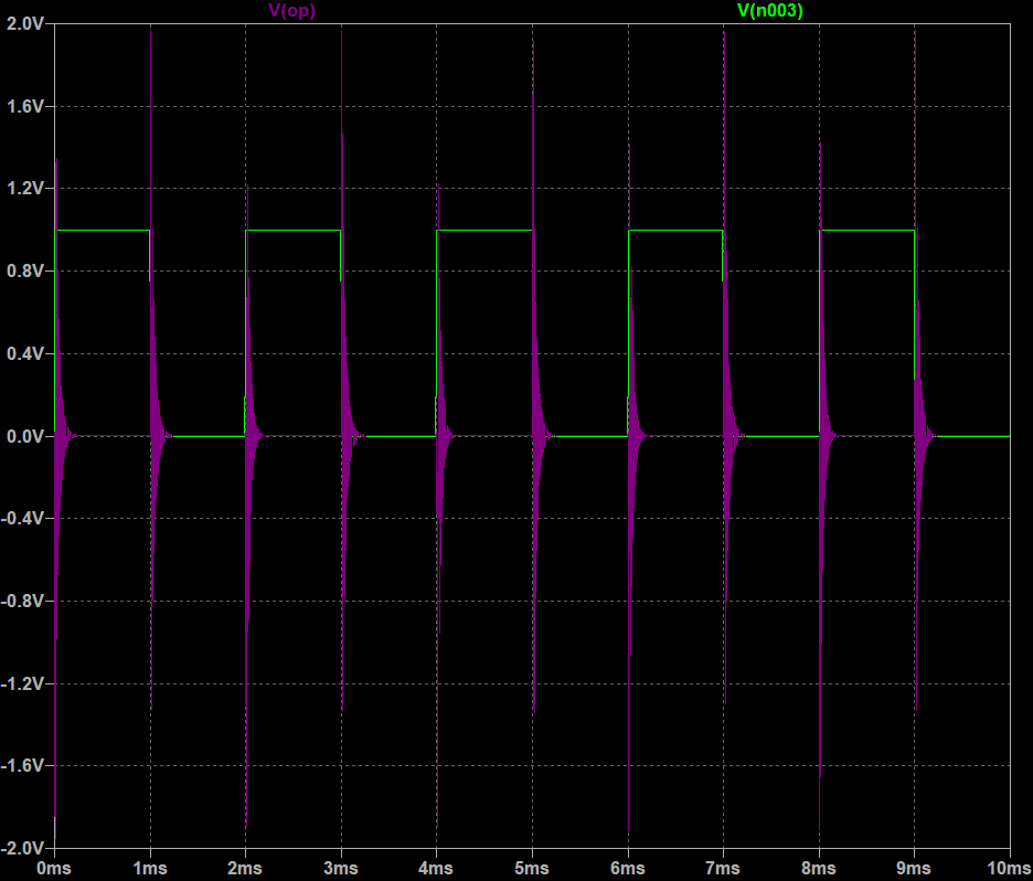 LTspice simulation — Differentiator with square wave input (green, V(n003)): output (magenta, V(op)) shows sharp impulse spikes at each rising and falling edge transition. confirming differentiation of a square wave.