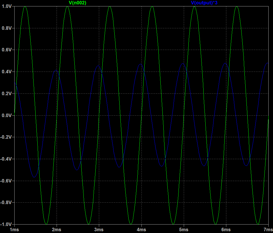 LTspice simulation — Integrator with sine wave input (green, V(n002)): output (blue, V(output)×3, amplified for visibility) is a cosine — 90° phase shift confirms integration. Frequency = ~700 Hz.