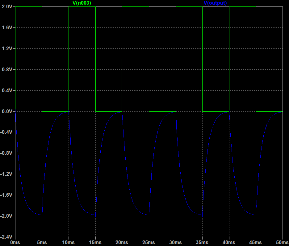 LTspice simulation — Integrator with square wave input (green, V(n003)): output (blue, V(output)) is a triangular wave. Integration of constant = ramp; alternating ramps produce triangle. Period = 10 ms.