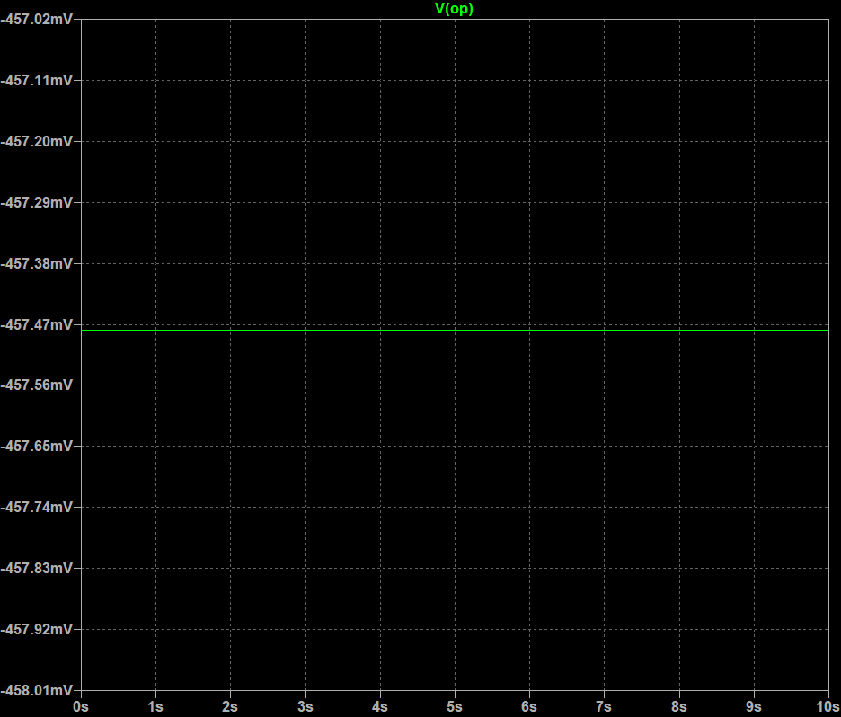 LTspice simulation — Log amp: Vin = 4 V → Vout = −457.47 mV. Flat DC line confirms steady-state log operation. Matches hardware observation of −457 mV at Vin = 4 V.