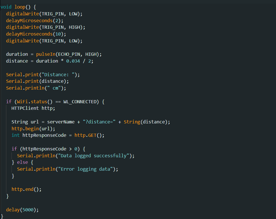 The ESP32 connects to a local Wi-Fi access point in Station (STA) mode and acquires a dynamic IP address through DHCP. Once connected, it sends distance data to a Google Apps Script web application using HTTP GET requests. The measurement value is passed as a URL query parameter. The Apps Script endpoint receives each request, parses the distance value, and appends a new row to a designated Google Sheet, automatically generating a server-side timestamp for each entry.