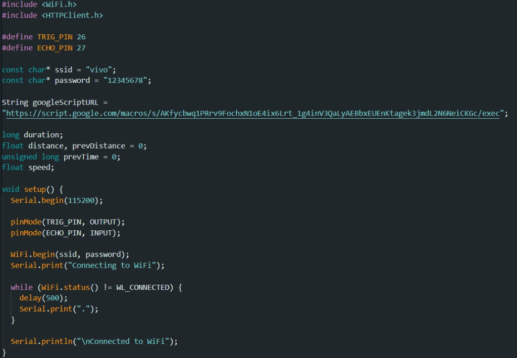 - The ESP32 successfully connected to the configured Wi-Fi network and transmitted the calculated speed data to Google Sheets.