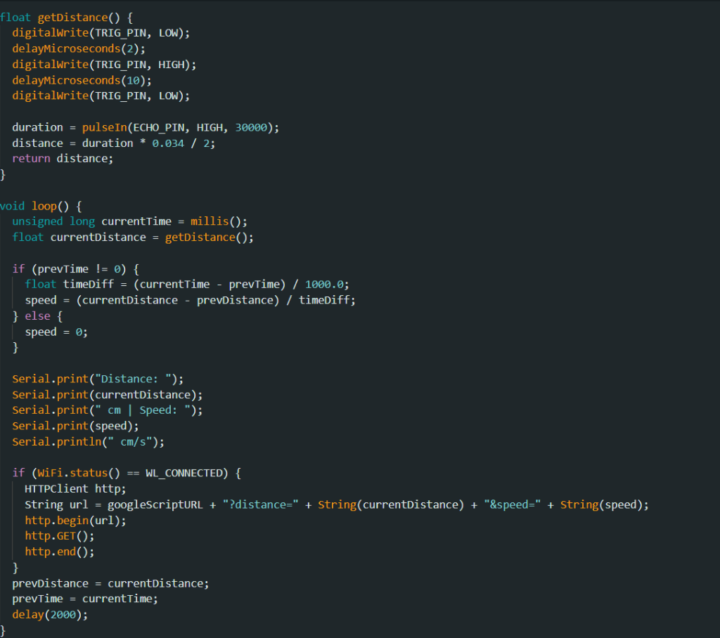 Under typical network conditions, ranges from 300 ms to 2 s. The firmware sampling interval must be set greater than to prevent request collisions and ensure every measurement is individually logged. The complete data pipeline is: HC-SR04 → ESP32 GPIO/Timer → Speed Calculation → Wi-Fi → Internet → Google Apps Script → Google Sheets.