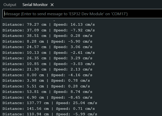 - Upload the program to the ESP32 and open the Serial Monitor to observe real-time distance and speed values by moving an object in front of the ultrasonic sensor.