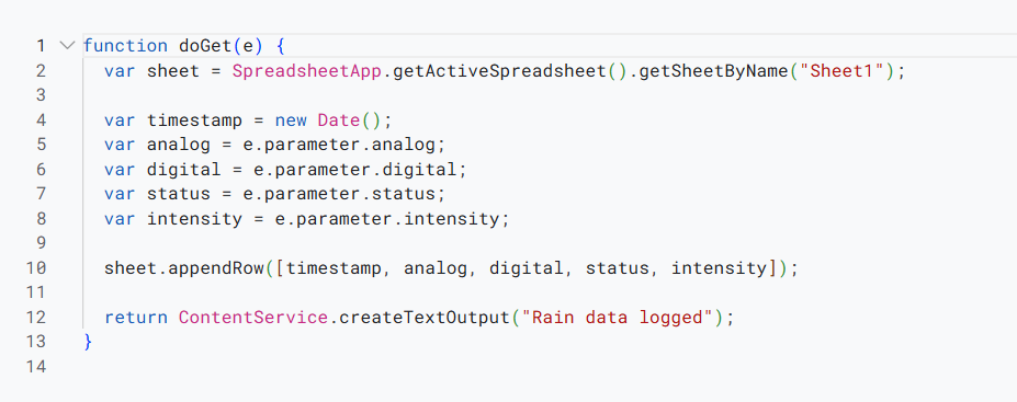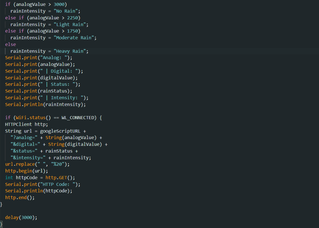 - Each set of analog and digital rain sensor readings was logged in Google Sheets along with the corresponding timestamp for further analysis.
