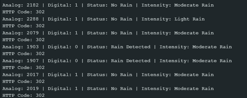 - Variations in rain intensity were reflected as changes in the analog sensor values, while the digital output indicated the presence or absence of rainfall.