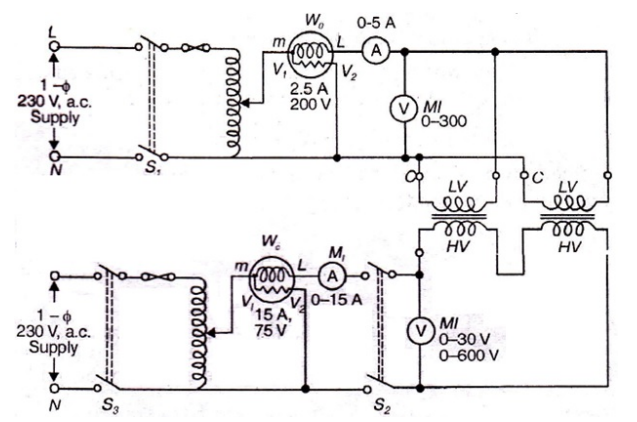 Circuit Configuration: The primary windings of both transformers are connected in parallel and supplied with rated voltage at rated frequency. The secondary windings of both transformers are connected in phase opposition (back to back), so the net voltage in the secondary loop is zero. On the secondary side, a low voltage — just sufficient to circulate full-load current — is injected using a separate variac.