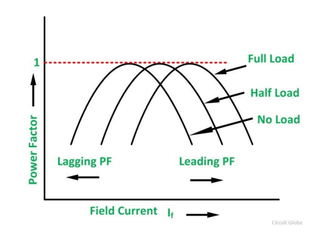 - The inverted V-curves (PF vs If) confirm that the power factor reaches a maximum value of unity at the normal excitation point for each load, with the peak shifting to a higher field current as load increases.