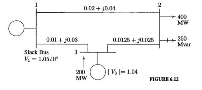 Q1. Figure 6.12 shows the one-line diagram of a simple three-bus power system with generators at buses 1 and 3. The magnitude of voltage at bus 1 is adjusted to 1.05 pu. Voltage magnitude at bus 3 is fixed at 1.04 pu with a real power generation of 200 MW. A load consisting of 400 MW and 250 Mvar is taken from bus 2. Line impedances are marked in per unit on a 100 MVA base, and the line charging susceptances are neglected. Obtain the power flow solution by the fast decoupled method including line flows and line losses.