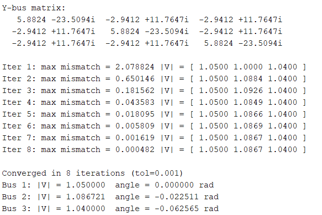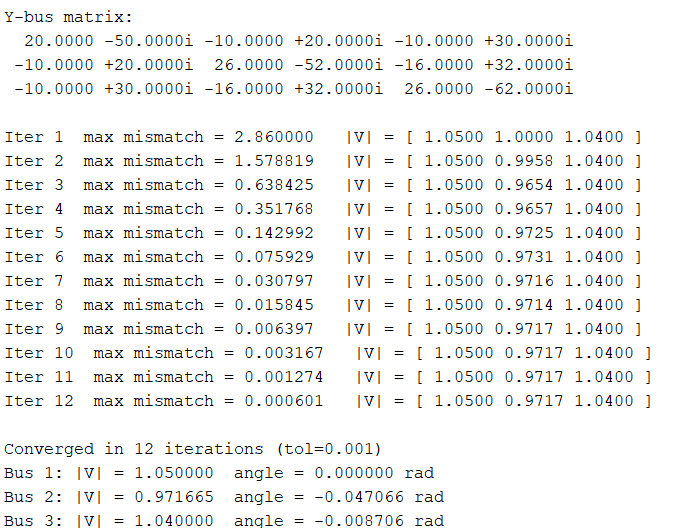 | Q1 | 3-Bus, no shunt admittance | 3 | 12 | V1 = 1.0500∠0.000 rad, V2 = 0.9717∠−0.047 rad, V3 = 1.0400∠−0.009 rad |