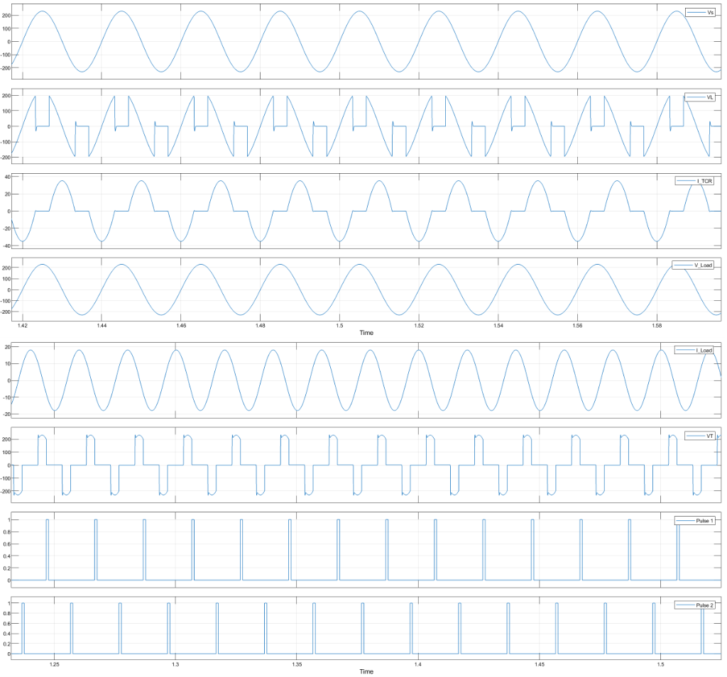 These results confirm the expected behavior of a Thyristor-Controlled Reactor: the non-linear switching action mainly affects the reactor current, while the source and load waveforms remain largely undisturbed and free from distortion. The harmonics are confined to the TCR branch and do not significantly propagate to the source or load.