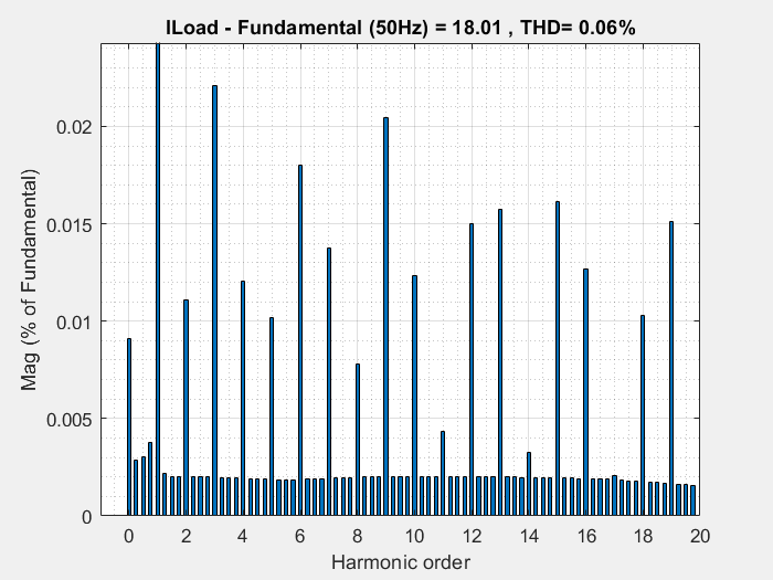 The THD of the load current is approximately 0.06%, which is negligible. The load current is very close to a sinusoidal waveform with no significant distortion.