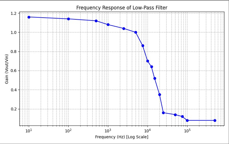 - Calculate gain (Vout/Vin) at each frequency and plot gain vs log(frequency) to obtain the frequency response curve.