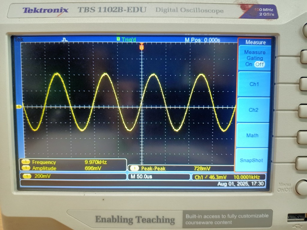 Output waveform of Low-Pass Filter at Cutoff Frequency (10 kHz). Measured Vout ≈ 696 mV, Vin = 1 V.