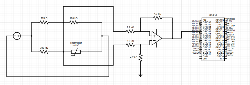Figure 1: Circuit diagram showing the thermistor Wheatstone bridge (270 Ω, 100 kΩ, 300 kΩ), differential amplifier (R1 = 4.7 kΩ, R2 = 2.2 kΩ), and ESP32 microcontroller with LCD display via I2C interface.